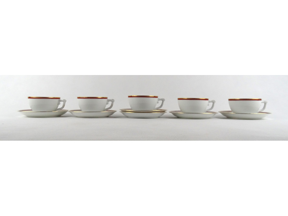 Régi szép állapotú, duplán jelzett, szépen aranyozott, fehér - piros porcelán kávéskészlet.