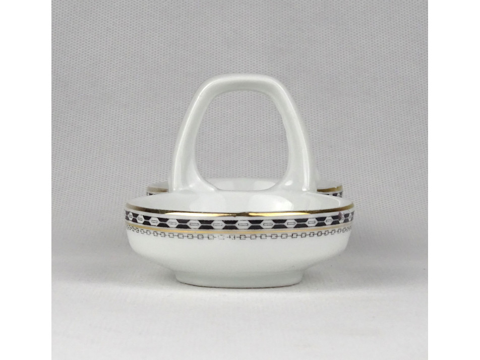Régi, hibátlan állapotú, jelzett porcelán só tartó, fűszertartó, fekete-arany díszítéssel.