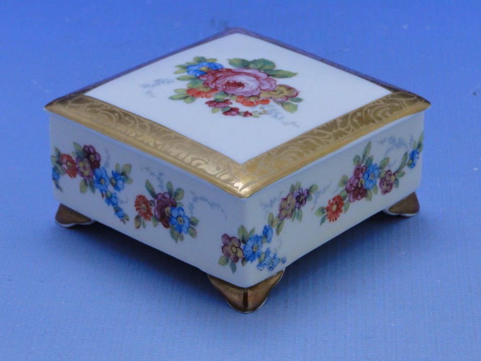Antik gazdagon aranyozott virágmotívumokkal dísztett szögletes alakú, négy pici aranyozott lábon álló, porcelán ékszertartó, gyűrűtartó bonbonier.