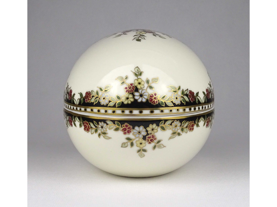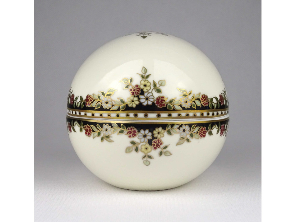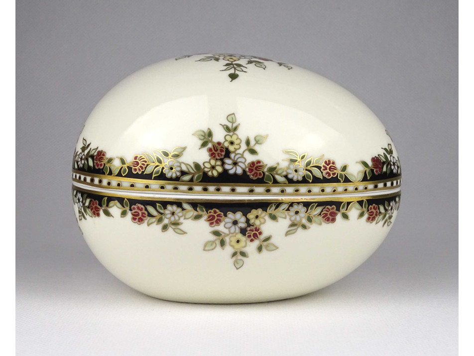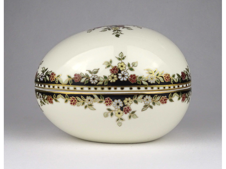 Hibátlan állapotú, vajszínű, aranyozással gazdagon díszített, nagyméretű, tojás alakú, különleges Sissy mintás Zsolnay porcelán gyűrűtartó, ékszertartó bonbonier.