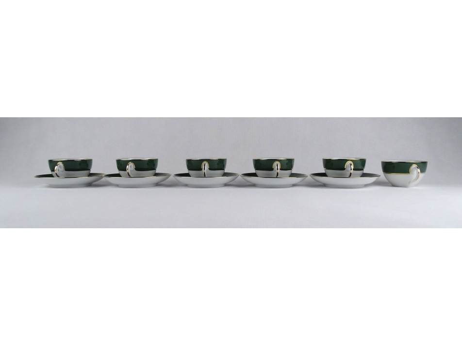 Hibátlan állapotú Zsolnay Olíva porcelán kávés készlet pótlás, zöld színű, aranyozott szegéllyel. 11 darab.