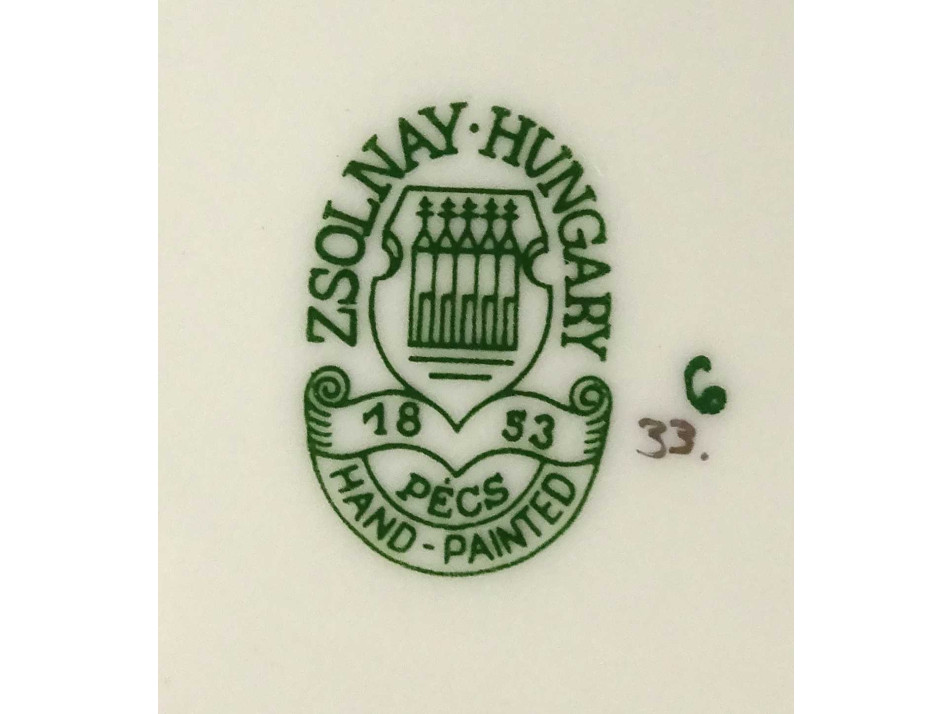 Alján zöld színű öttornyú Zsolnay márkajelzés: