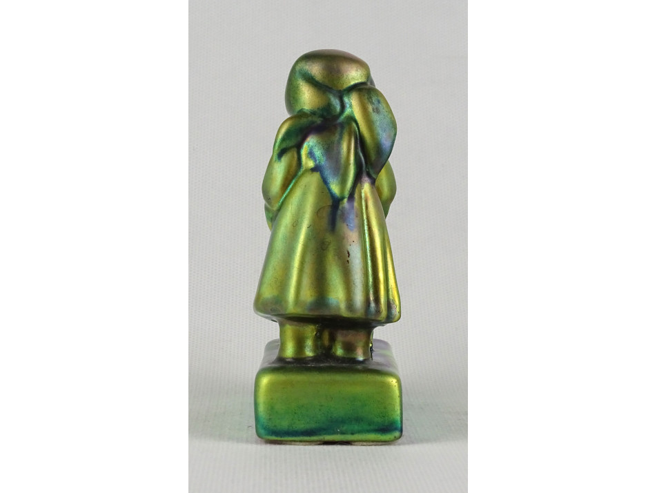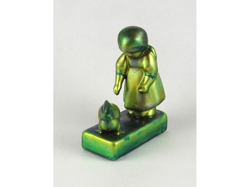 Régi, szép állapotú, eozén Zsolnay porcelán tyúkot etető kislány szobor talapzaton.