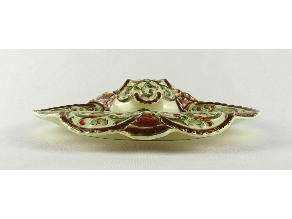 Nagy méretű, hibátlan állapotú, gazdagon aranyozott vajszínű Zsolnay porcelán névjegytál dísztál. Kézzel festett virág motívumokkal díszített.