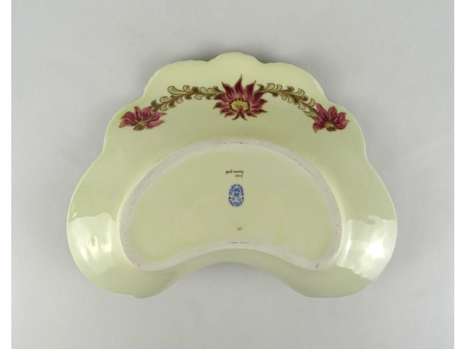 Nagy méretű vajszínű virágmintás Zsolnay kagyló alakú porcelán névjegytál 30 cm