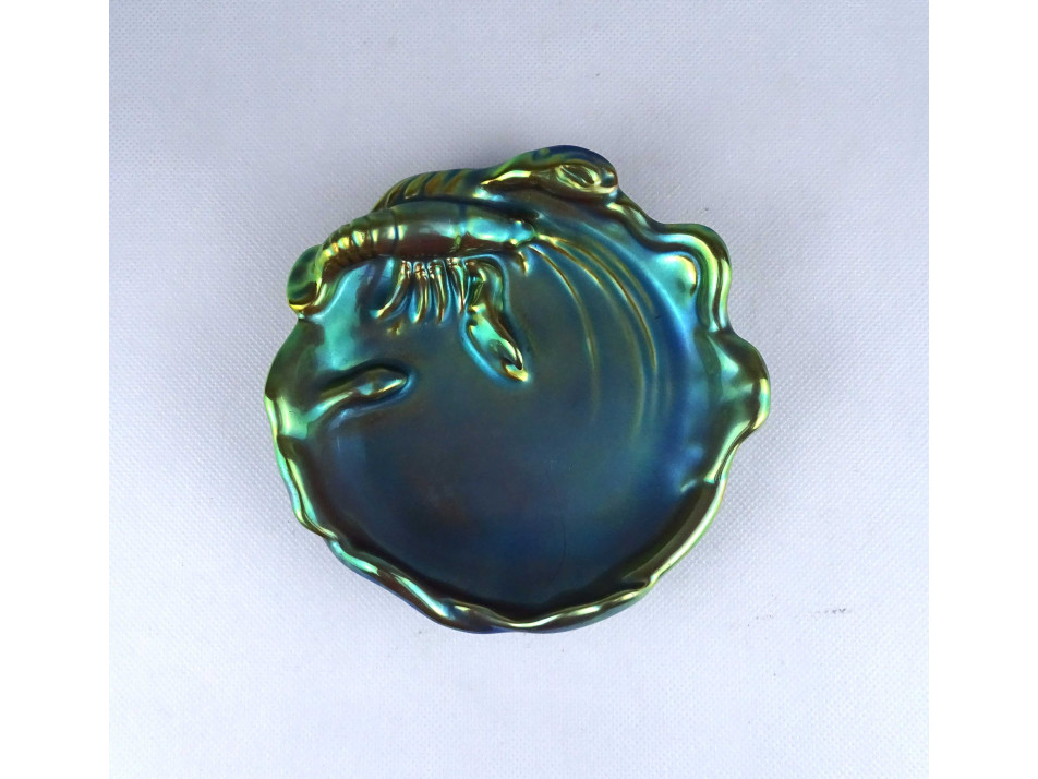 Régi, hibátlan állapotú, zöld eozin mázas Zsolnay porcelán névjegykártyatartó tál, kínáló tál, hamutál. A tál széle fodros, hullámos. A tálat egy nagy méretű rák vagy homár díszíti.