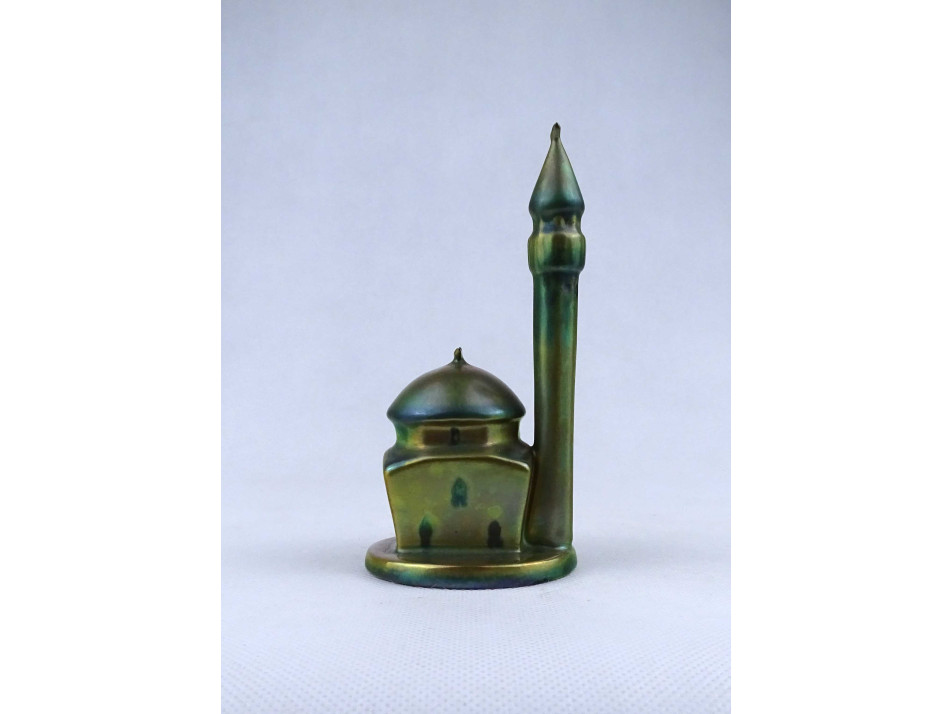Hibátlan állapotú, jelzett zöld eozin mázas Zsolnay porcelán dzsámi minarettel.