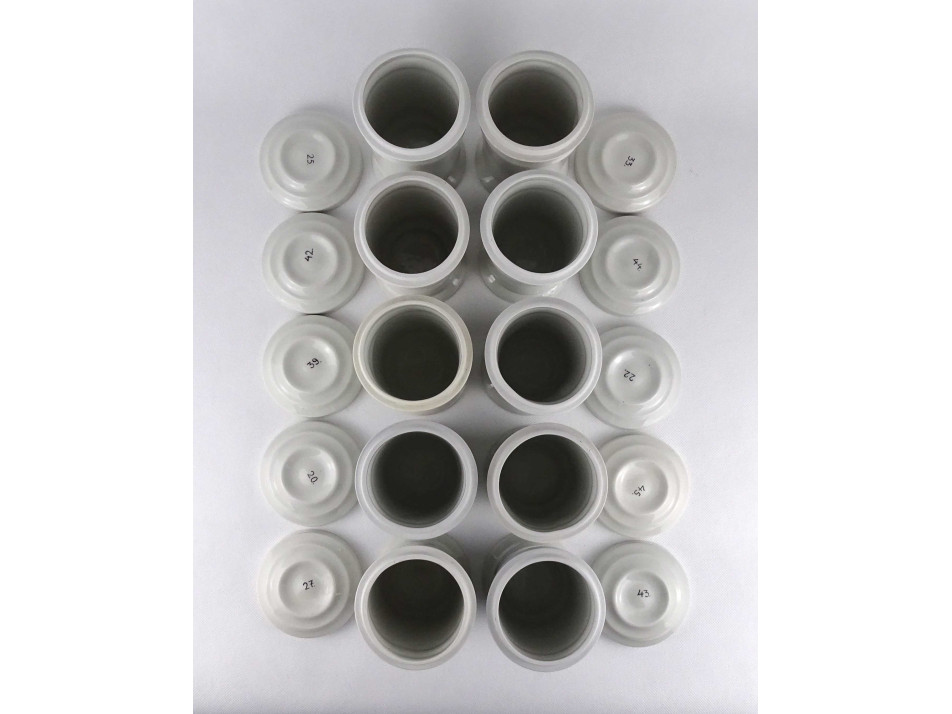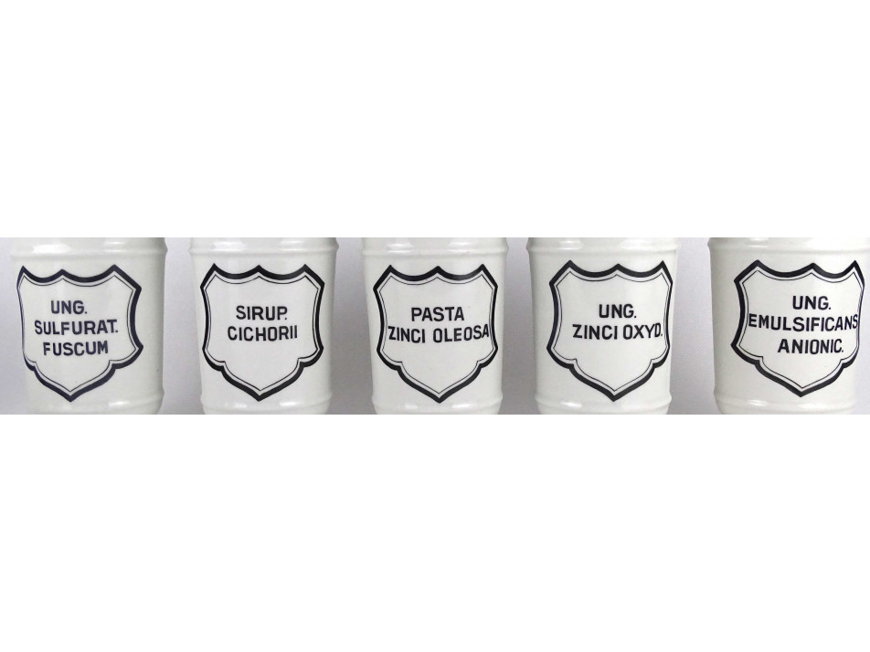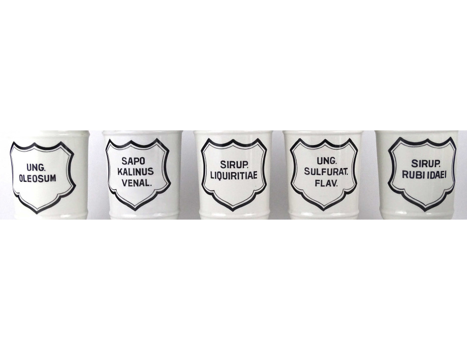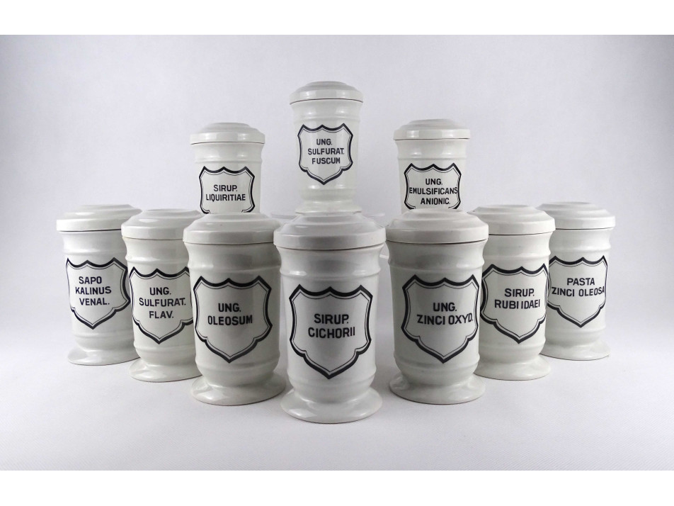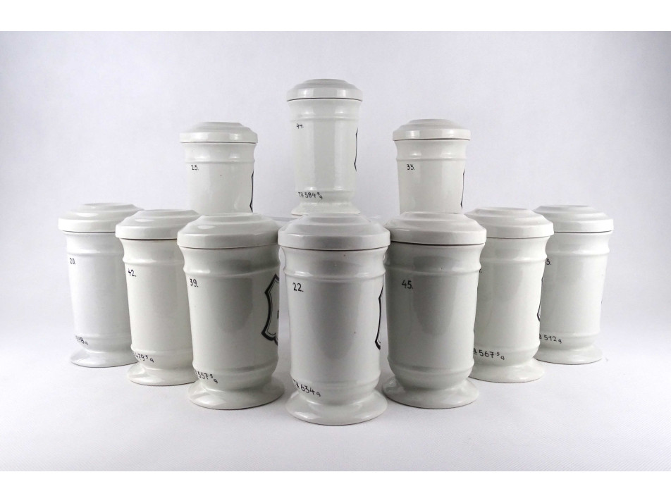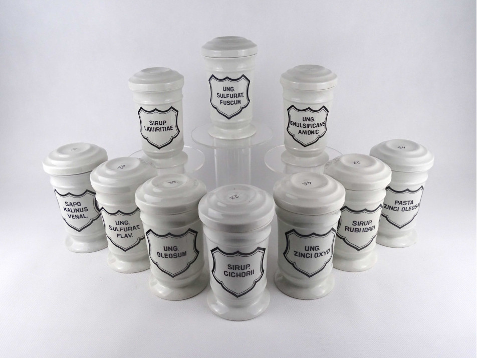 Hibátlan állapotú, nagyméretű gyógyszertári patika edény, tároló csomag. Vastagfalú Zsolnay porcelán tégelyek, porcelán fedéllel, 10 darab egyben.