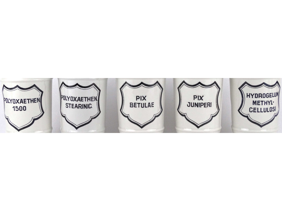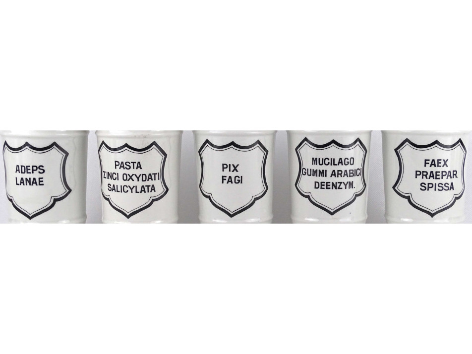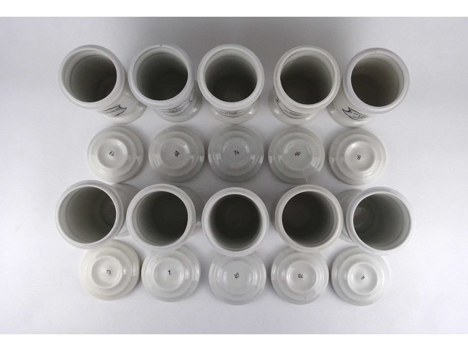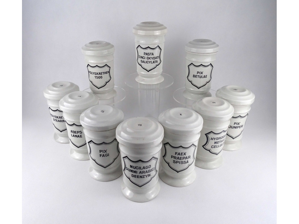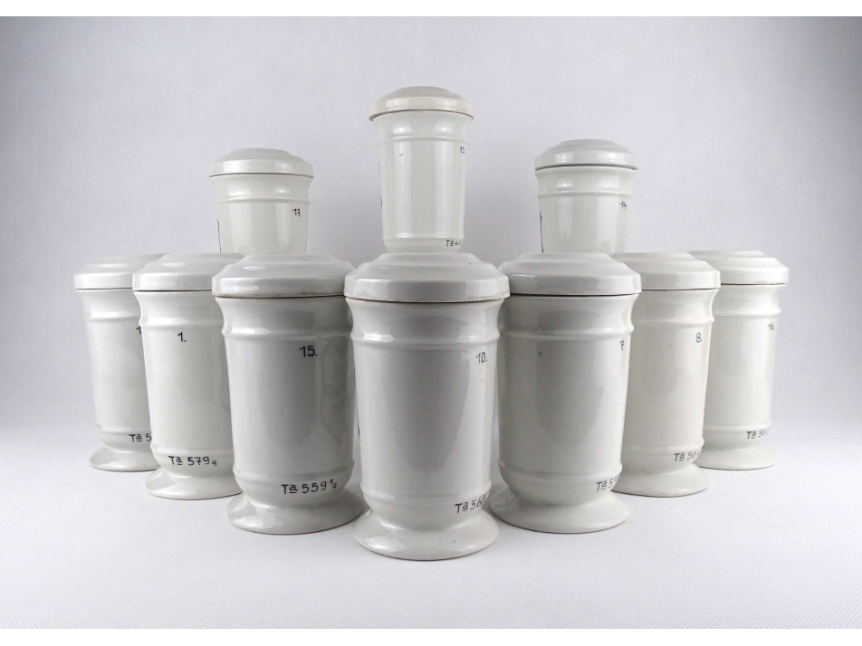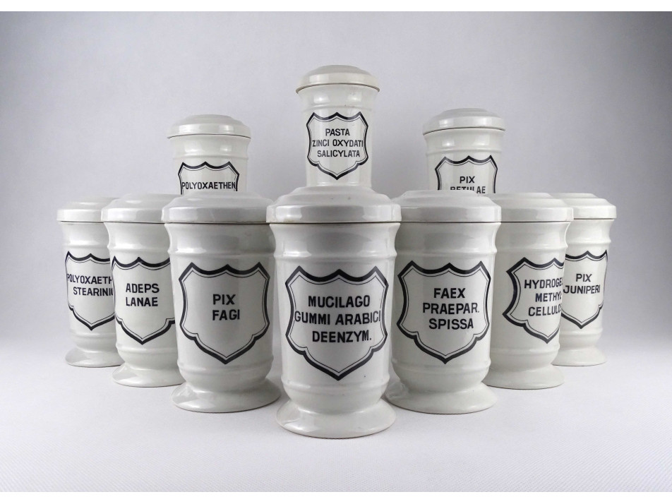 Hibátlan állapotú, nagyméretű gyógyszertári patika edény, tároló csomag. Vastagfalú Zsolnay porcelán tégelyek, porcelán fedéllel, 10 darab egyben.