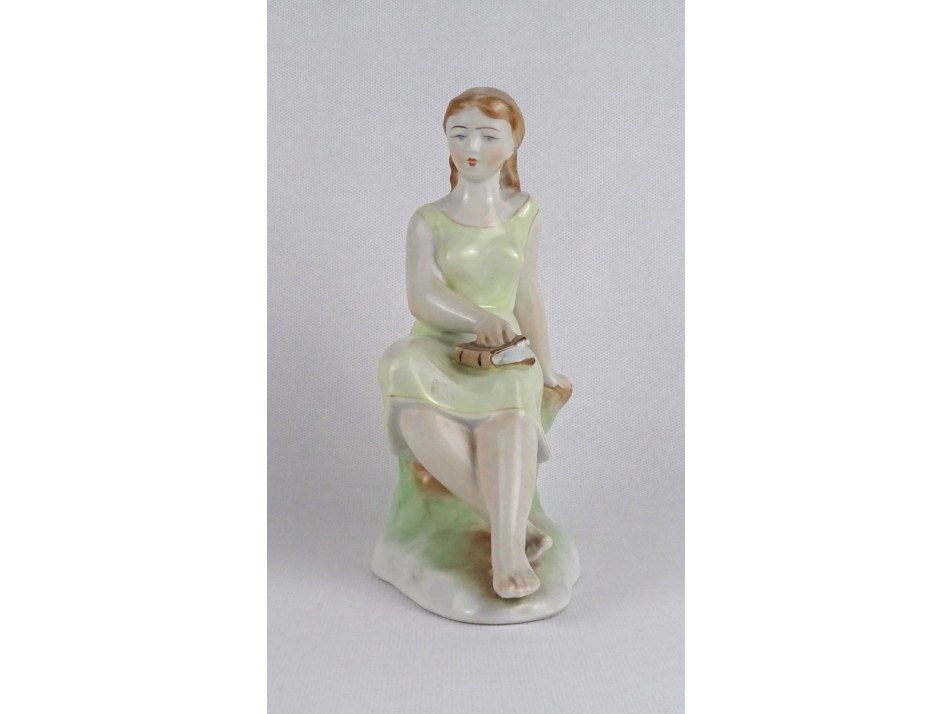 Hibátlan állapotú, jelzett Zsolnay porcelán szobor. Fa rönkön ülő lány, kezében könyv.