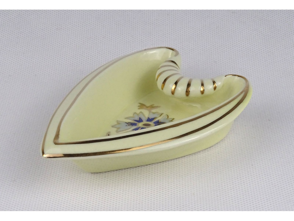Hibátlan állapotú vajszínű, gazdagon aranyozott, kék búzavirág mintával díszített hamutál, hamus.