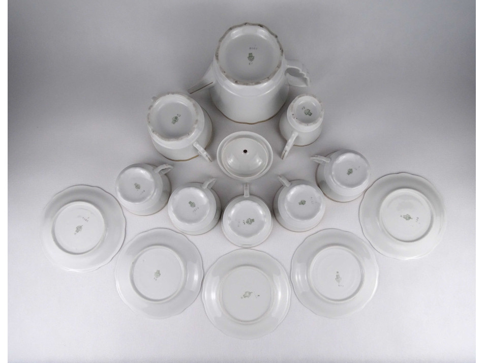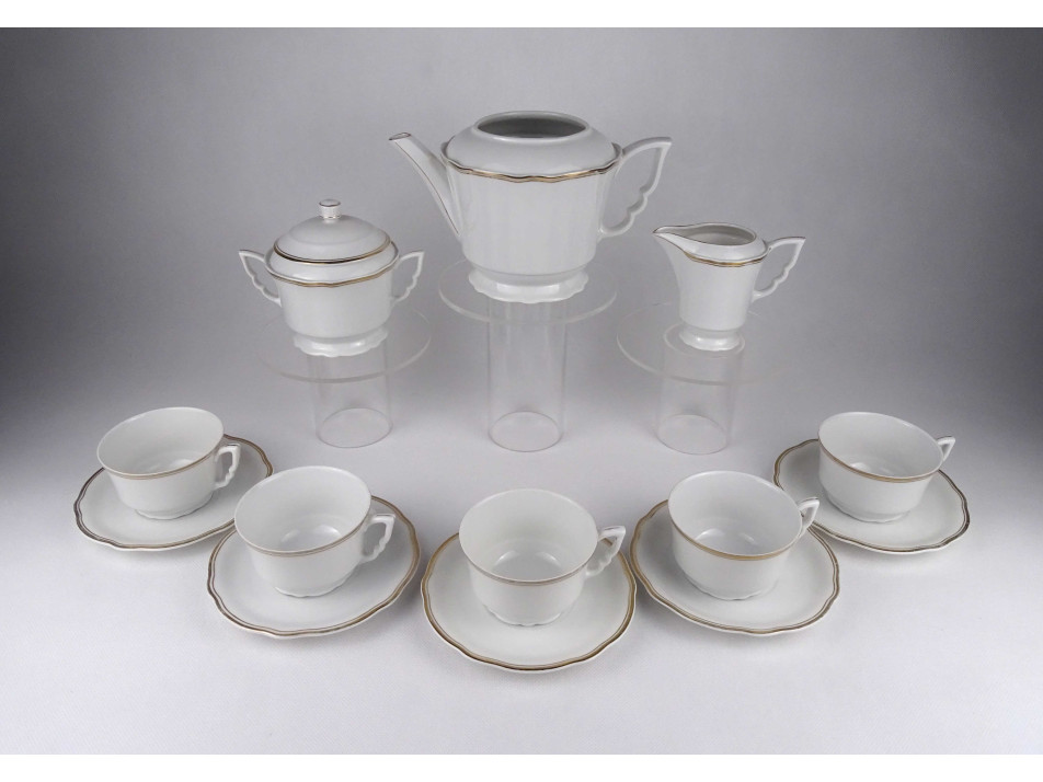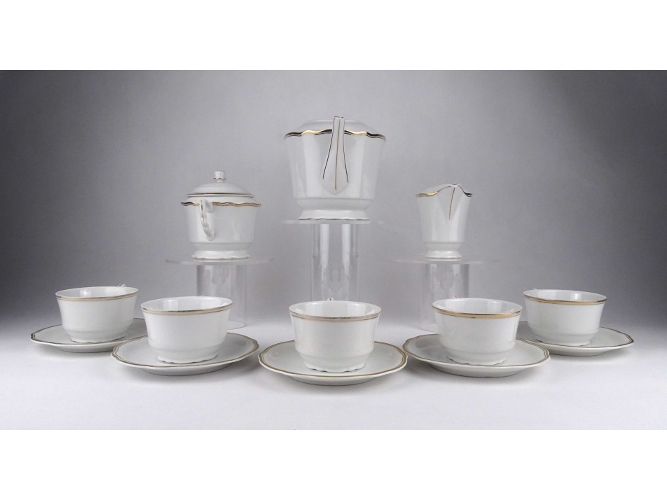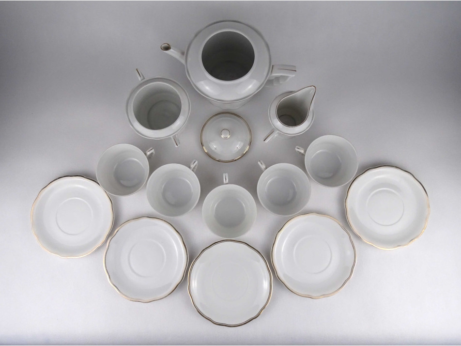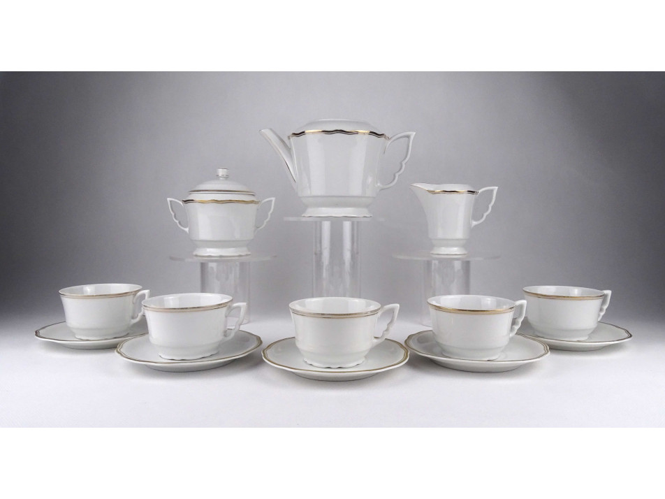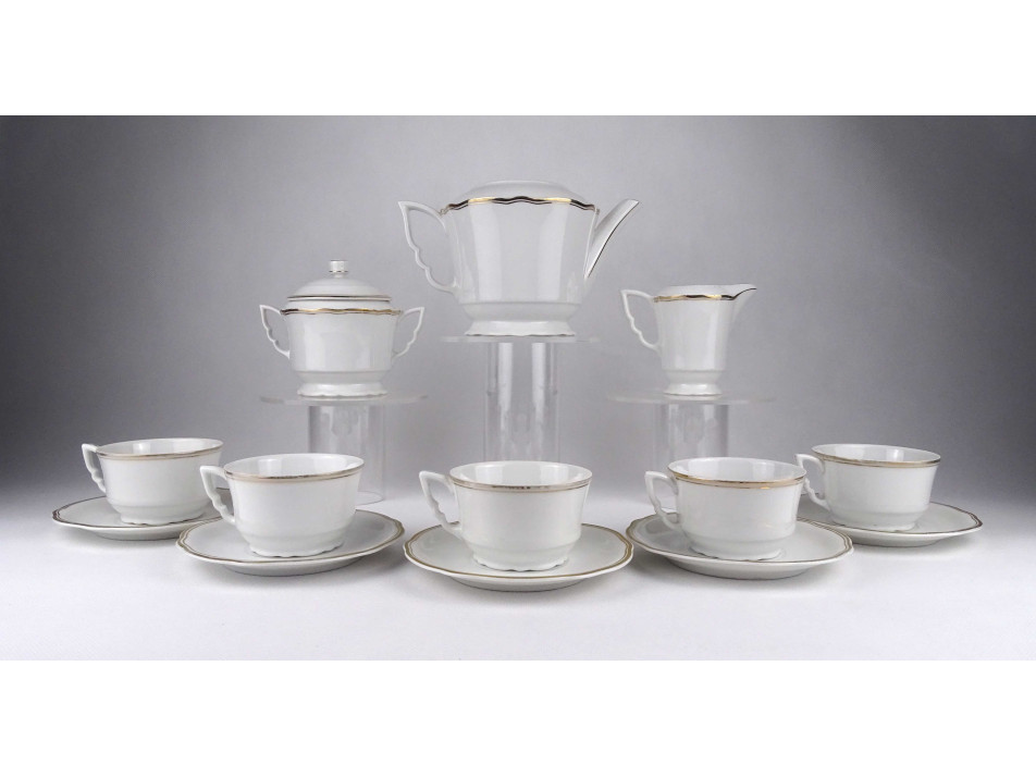 Szép állapotú, 5 személyes aranyozott szélű, festetlen barokkos Zsolnay porcelán teás készlet. 13 darabos.