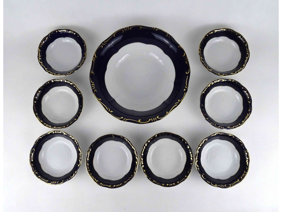 Hibátlan állapotú, Zsolnay porcelán Pompadour kompótos készlet gazdagon aranyozva, kobaltkék mázzal.
