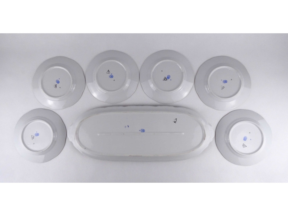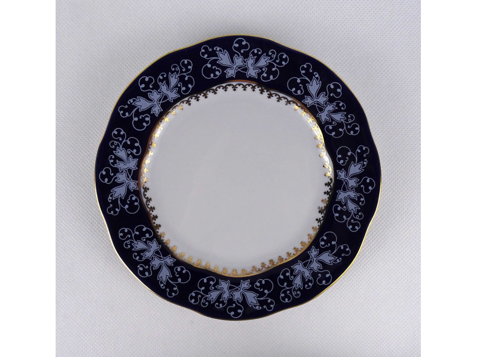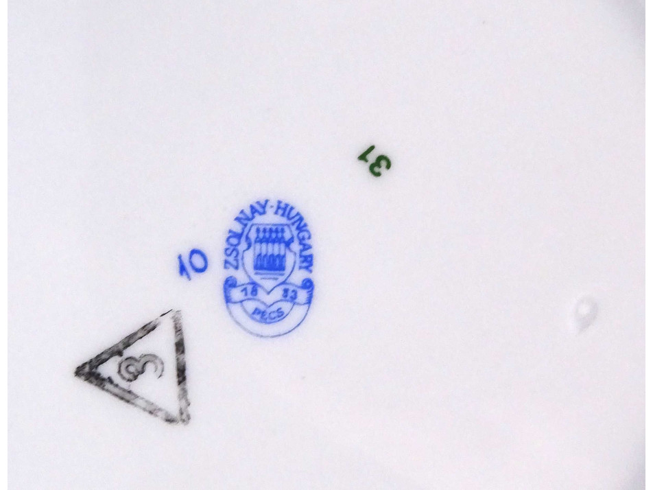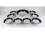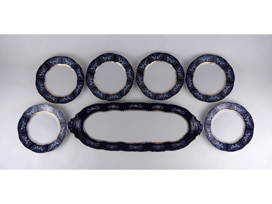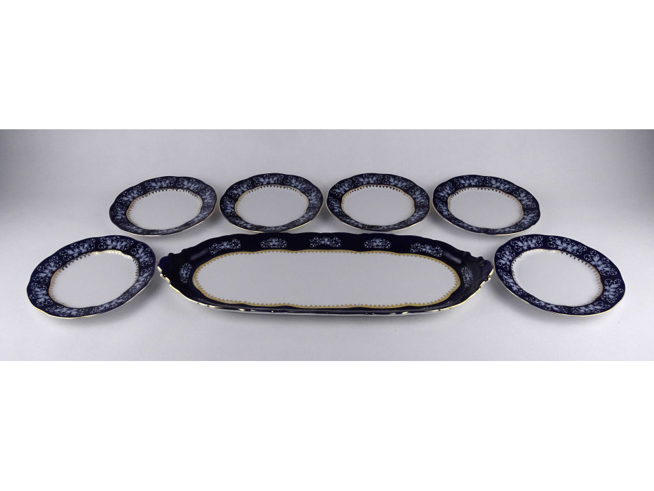 Hibátlan állapotú, Zsolnay porcelán Pompadour süteményes készlet gazdagon aranyozva, kobaltkék mázzal.