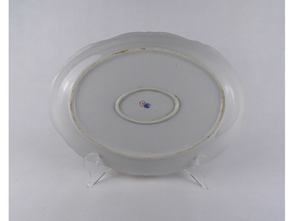 Régi, nagyméretű, ovális alakú, barokkos, aranyozott szélű, apró virág mintás Zsolnay porcelán pecsenyés tál, pecsenye kínáló.