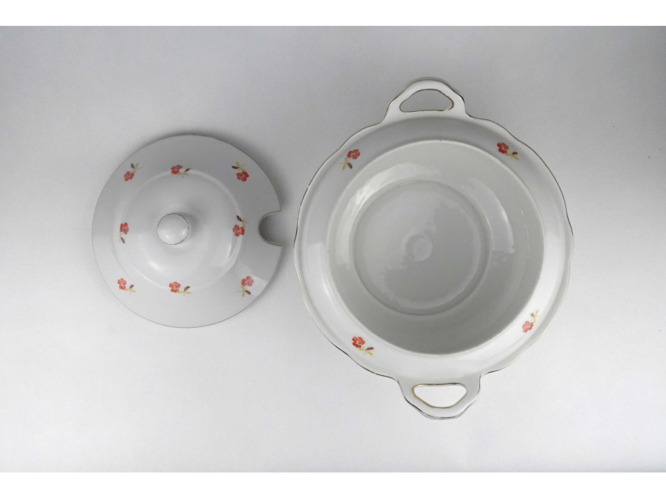 Régi, hibátlan állapotú, jelzett, porcelán levesestál fedővel, virágmintákkal díszítve.