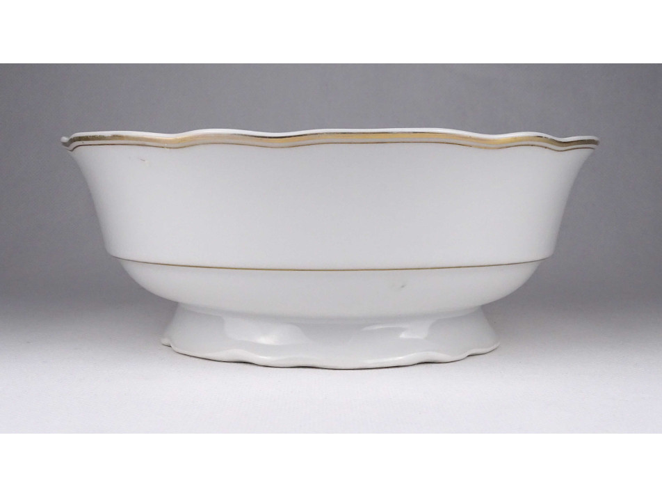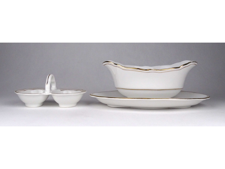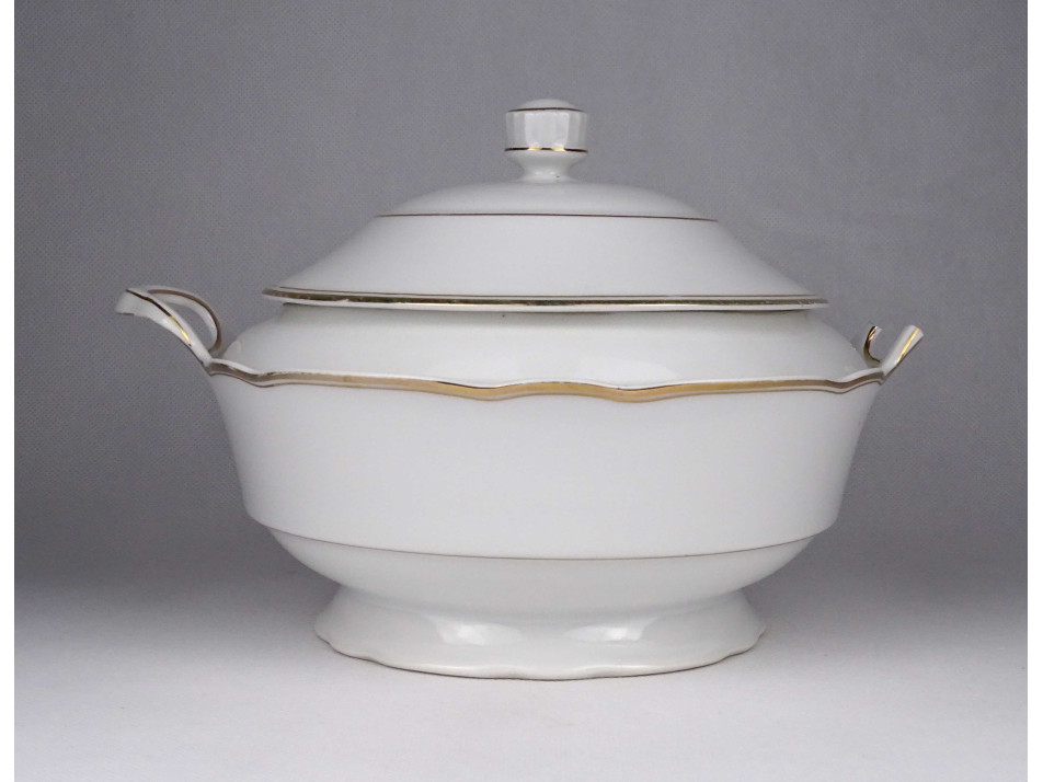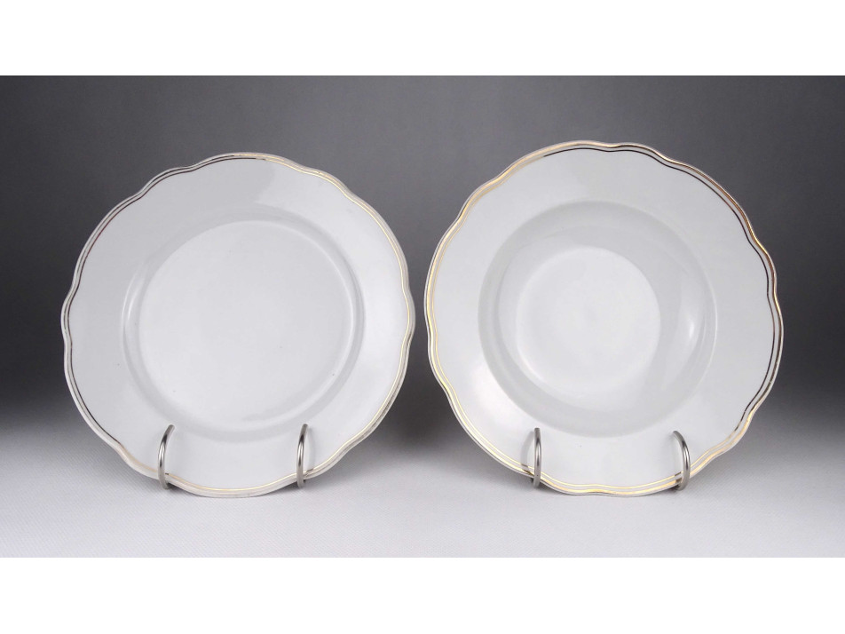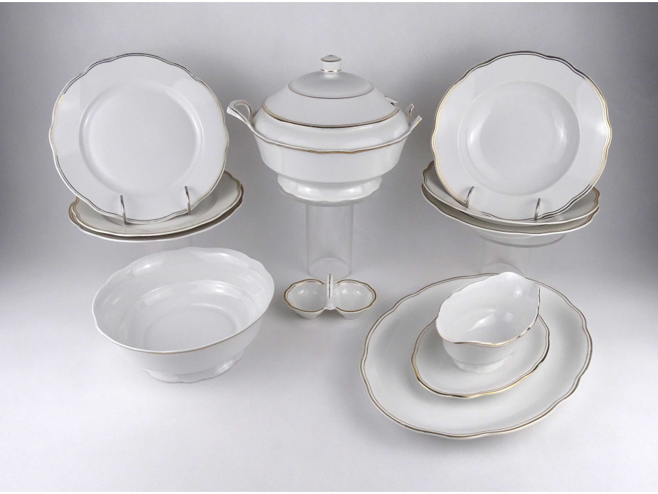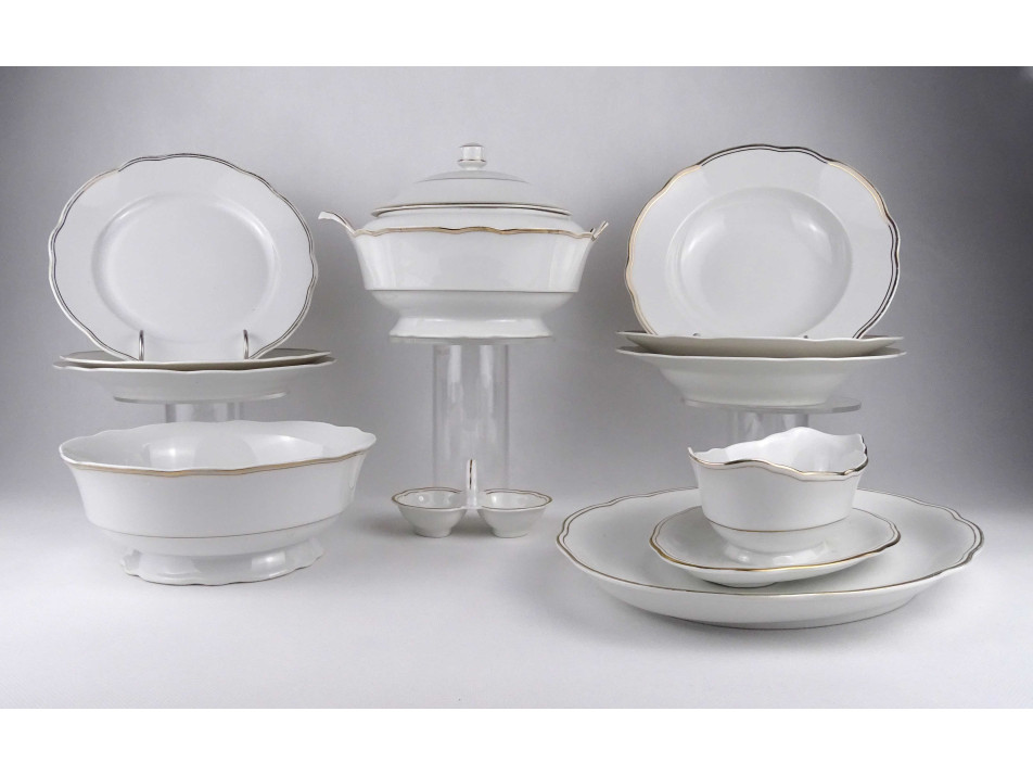Szép állapotú, aranyozott szélű, festetlen barokkos Zsolnay porcelán étkészlet. Jelen állapotában 3 személyes, inkább meglévő készletek pótlására alkalmas. 11 darabos.