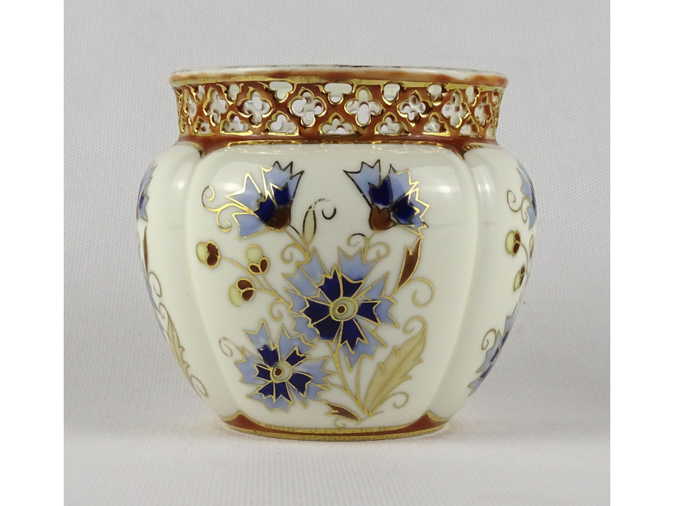 Hibátlan vajszínű áttört búzavirágos Zsolnay porcelán kaspó