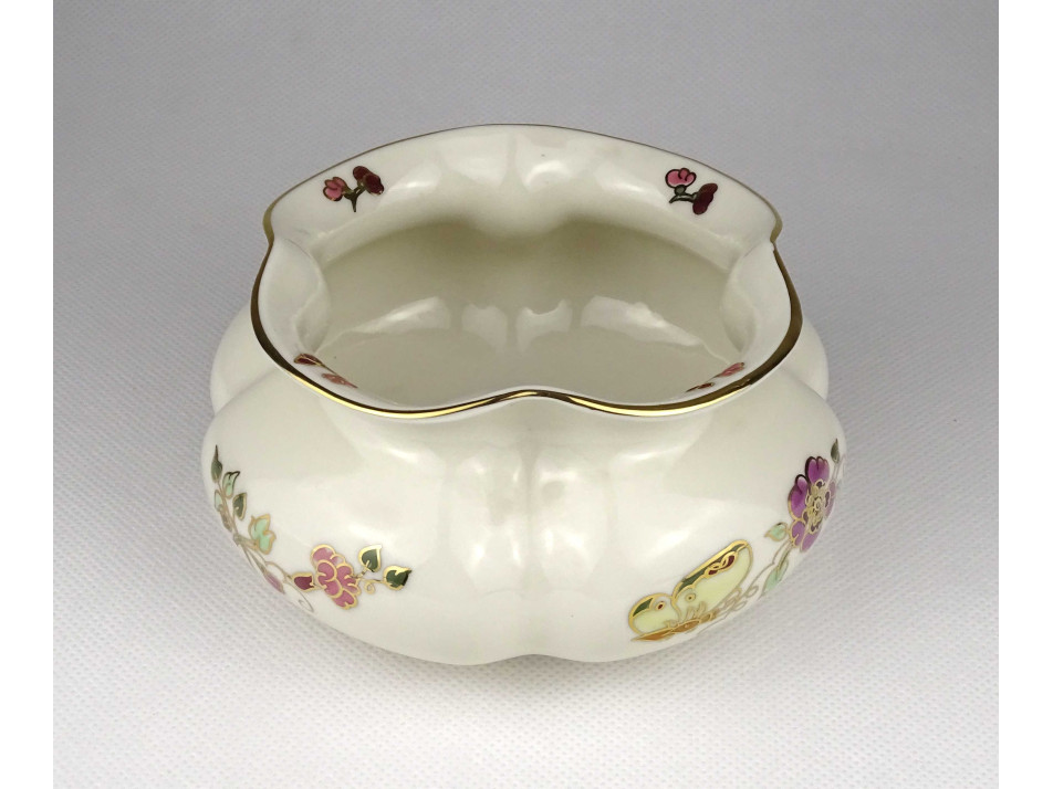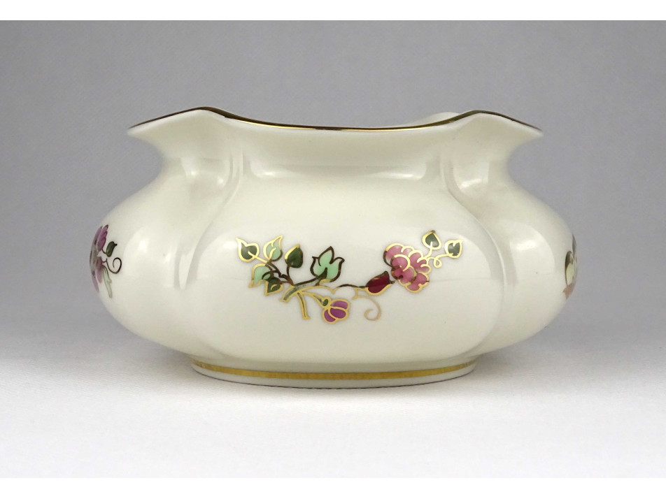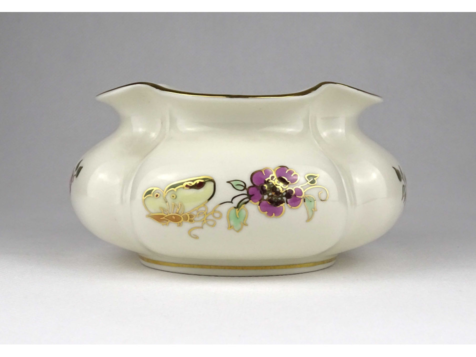 Hibátlan állapotú, gazdagon aranyozott, virágmintás, pillangós, öblös, gerezdes Zsolnay porcelán váza.