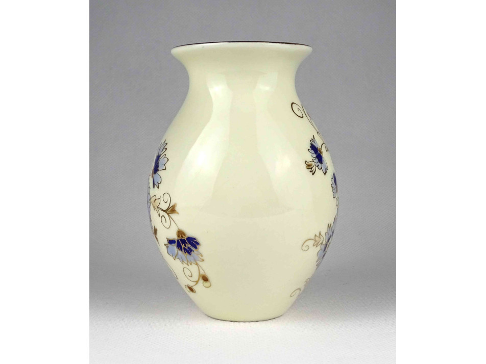 Hibátlan állapotú, vajszínű aranyozott Zsolnay porcelán díszváza búzavirág mintás díszítéssel. A mázat a váza teljes felületén apró repedések borítják.
