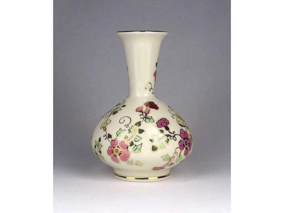 Hibátlan állapotú, aranyozással díszített virág és pillangó mintás vajszínű porcelán váza.