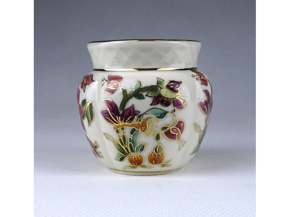Vajszínű aranyozott orchidea mintás Zsolnay porcelán váza kis kaspó 6.7 cm