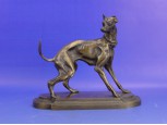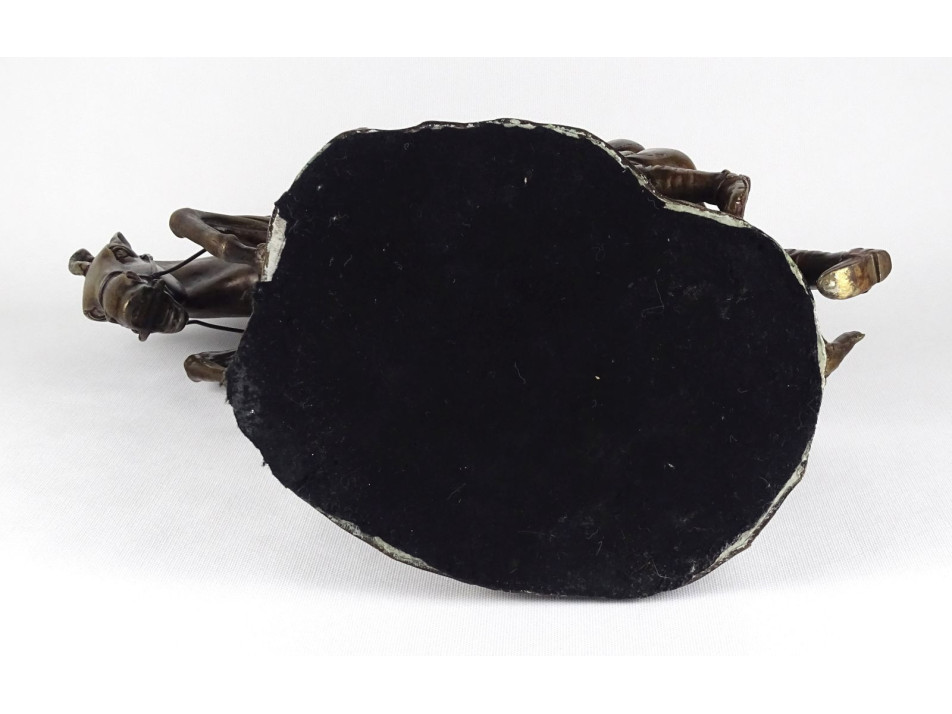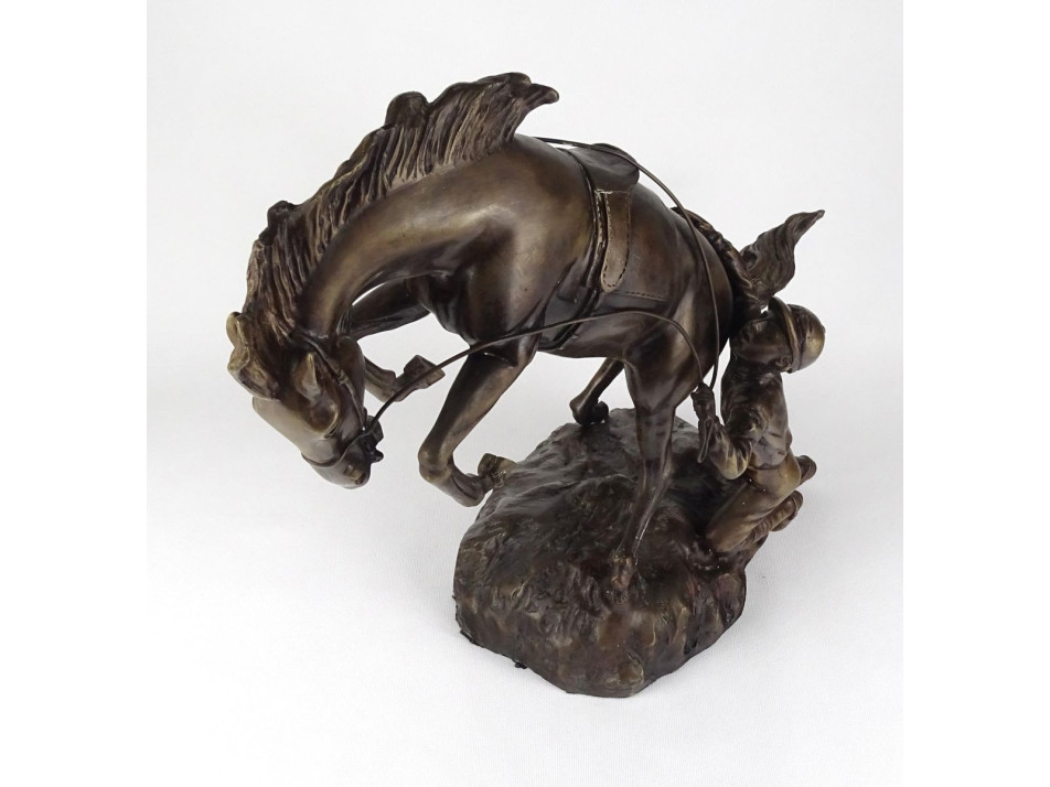 Nagy méretű, hibátlan állapotú lovas szobor. Ágaskodó ló szobor, mellett térdelő zsoké, lovas. A talapzat gipsszel kiöntött.