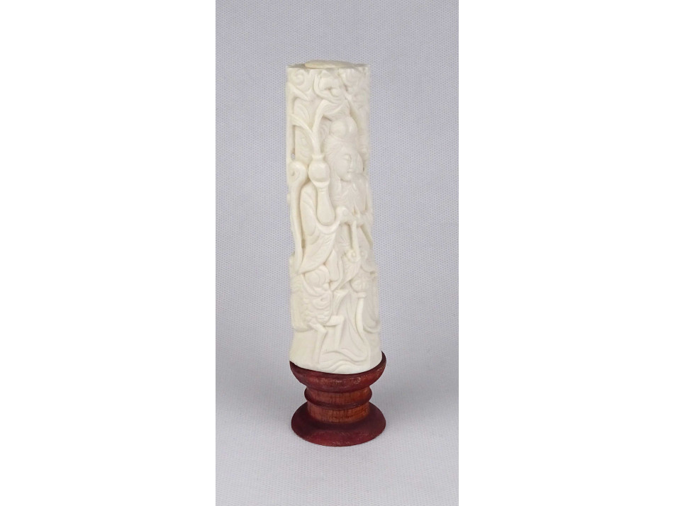 Hibátlan állapotú, fa talapzaton álló, csontból faragott kisméretű jelzetlen keleti szobor, csontszobor. Minden oldalról szépen kidolgozott, megmunkált faragás.