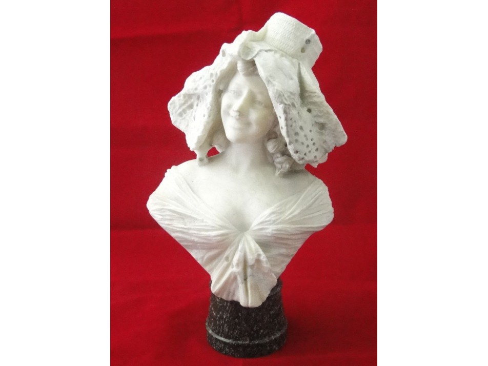 1880 - 1900 környéki antik kalapos, márvány talapzatos alabástrom női mellszobor, büszt.
