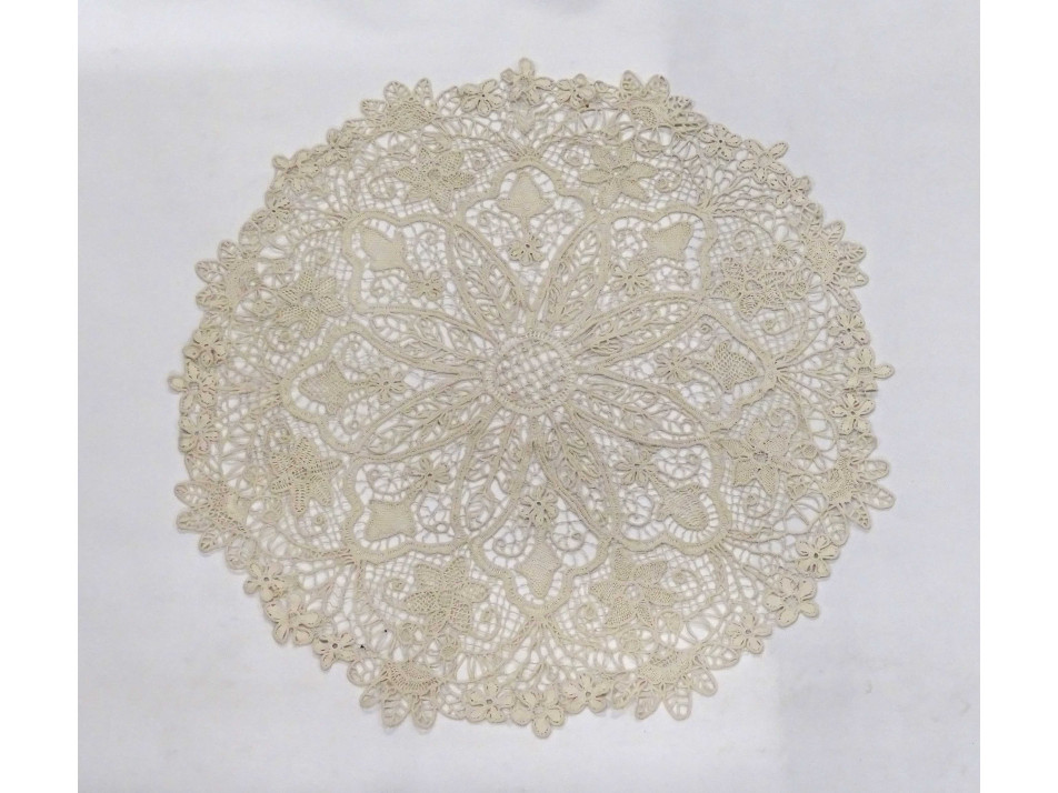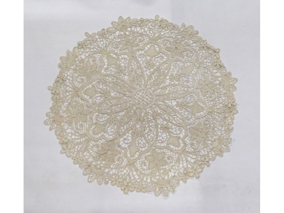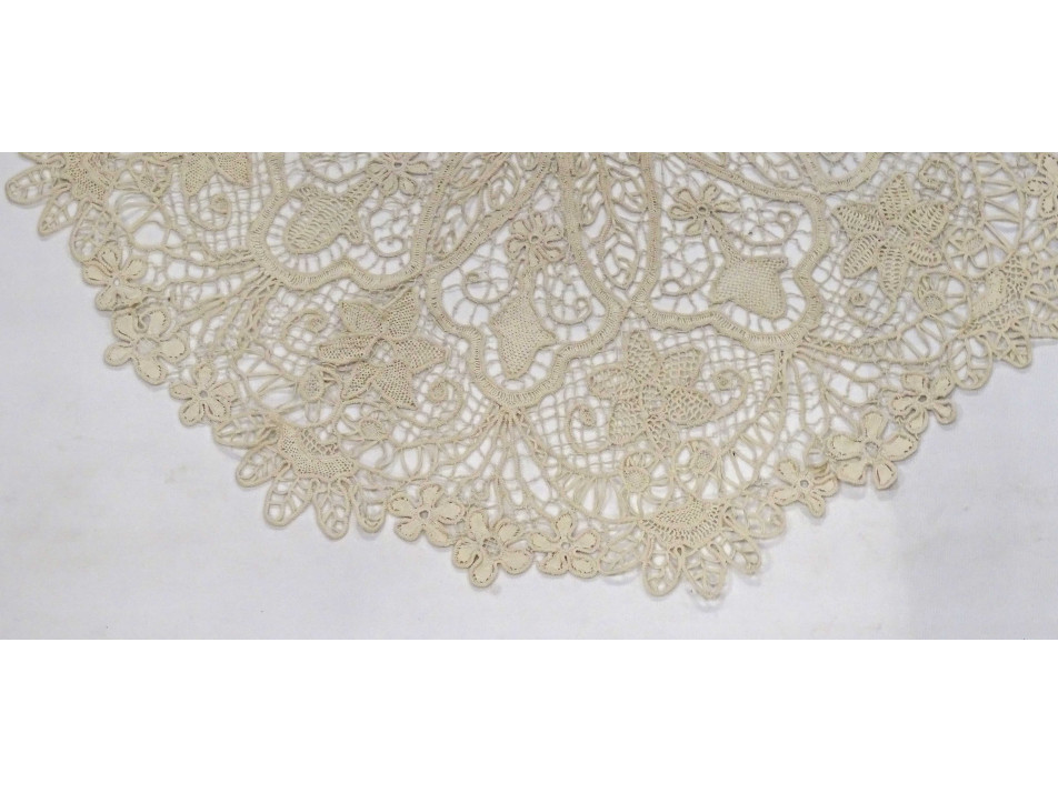 Antik, hibátlan állapotú, nagyméretű kör alakú, gazdagon hímzett fehér csipketerítő, aprólékos kézimunka.