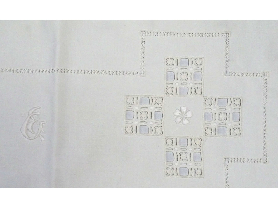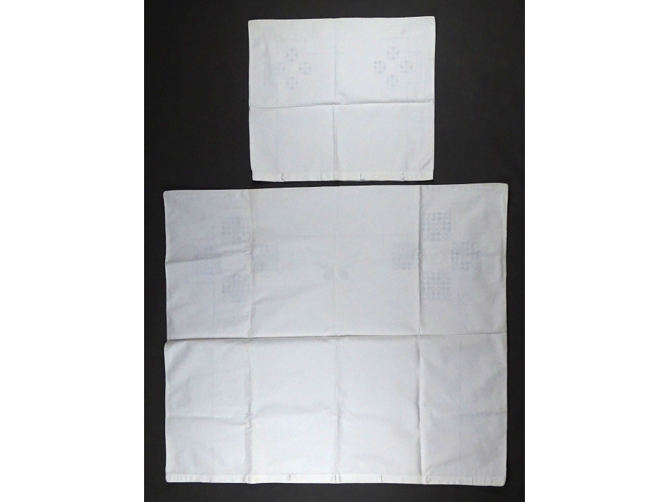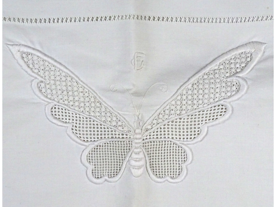 Régi, hibátlan, újszerű állapotú, horgolt pillangóval díszített, vékony fehér vászon párnahuzat garnitúra.