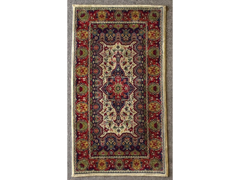 Kis méretű gépi szövésű keleti mintás virágdíszes szőnyeg. Szép állapotú, vastag húsú darab.