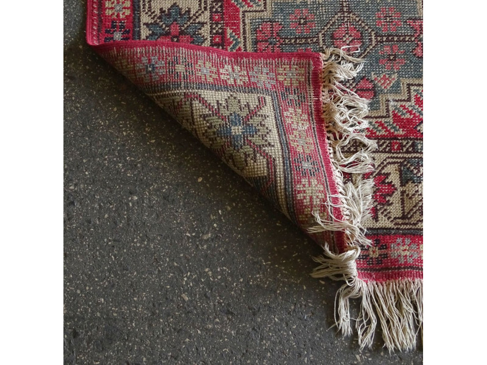Régi kézi csomózású keleti középméretű összekötő szőnyeg 1930-40-es évekből való darab. Rojtjai épek, szépek. A szőnyeg felülete kopottas.