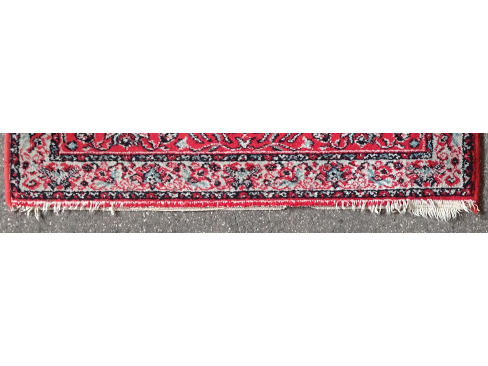 Régi piros keleti állatmintás gépi szövésű szőnyeg 92 x 183 cm