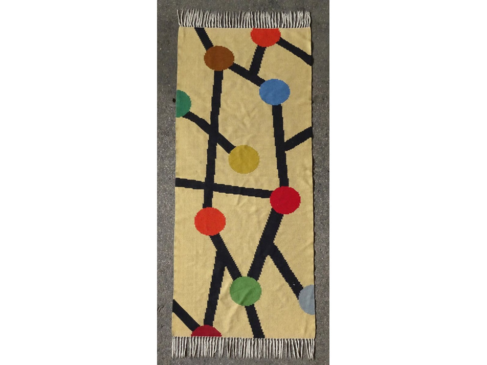 Erdélyi torontáli összekötő szőnyeg, előszoba szőnyeg, futó szőnyeg. Szép állapotú darab, sérült rojtokkal. Főbb színei: bézs, fekete, piros, zöld, kék, barna. Tisztításra szorul.