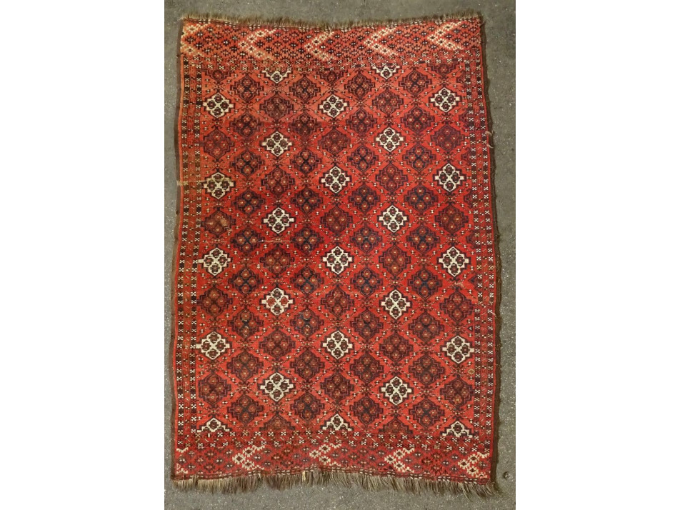 Antik XIX. század végi kézi csomózású bordó színű szőnyeg, középszőnyeg. Kissé kopottas. Korábban faliszőnyegként is használták, ennek nyoma az egyik hosszanti oldalán látható, hátul végig varrt, lásd fotó.