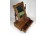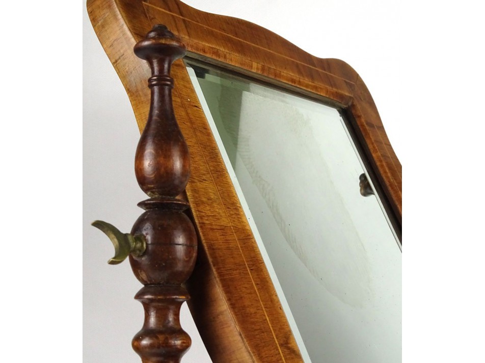 Antik, szép állapotú billenő tükrös, fiókos pipere vagy borotválkozó tükör. Benne metszett, fazettázott vakfolt mentes tükör található. Két részre osztott fiókja működő zárral és egy darab kulccsal rendelkezik. A tükröt tartó réz csavar feje félholdat mintáz. A furnérozott felületeket finom vonal intarzia díszíti. Néhány kisebb furnérhiba található rajta, lásd fotó.