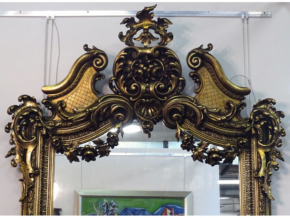 Gyönyörű antik, hatalmas méretű, hibátlan állapotú aranyozott tükör, alatta márványlapos konzolasztal. Tetején gyönyörű, részletes, gazdagon díszített nagy méretű ornamentika. A márványlap sérült, az alsó tükör vakfoltos, lásd fotó.