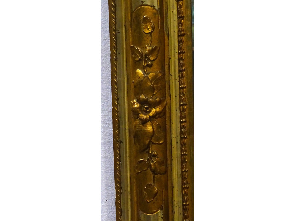 Antik, nagyméretű, aranyozott biedermeier fali tükör, szép eredeti állapotban, falra akasztási lehetőséggel. Benne eredeti vastag, nehéz tükör található, teljesen ép, vakfoltmentes állapotban. Hátulja deszkázott.