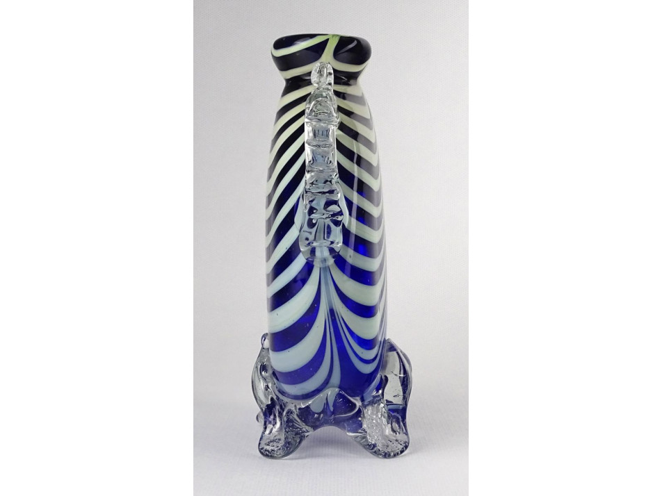 Hibátlan állapotú, kék-fehér, lapos csíkos üveg váza, fújt üveg díszváza. Fülekkel rendelkező, lábon álló gyönyörű üvegműves dísztárgy.