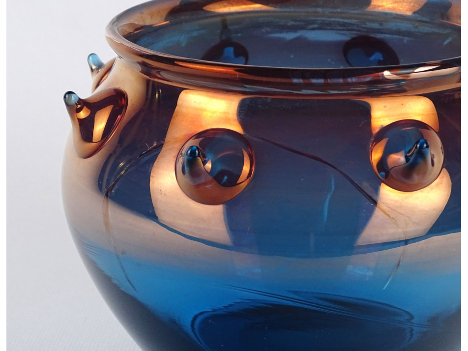 Gyönyörű velencei bütykös irizáló bikolor fújt üveg kaspó amelyet Murano szigetén, Velence közelében, Olaszországban készítette Gino Cenedese. A kaspó fala sajnos repedt, lásd fotó. Hibátlanul nagy értékű, cca 150ezer forint körüli értéket képvisel.