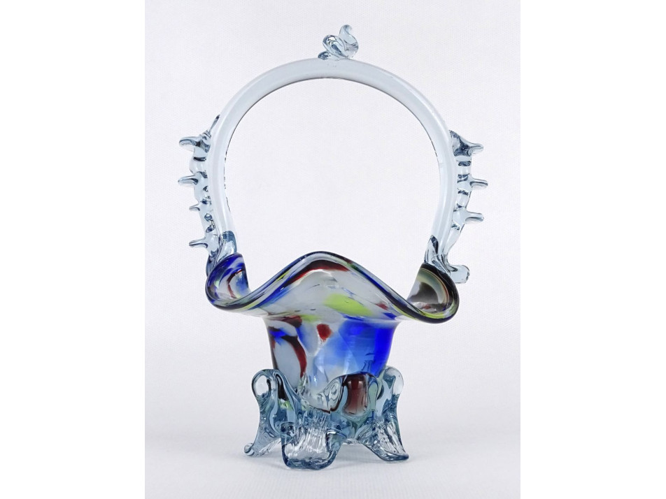 Hibátlan állapotú, kékkel, sárgával színezett művészi üveg kosár dísztárgy, cseh fújt üveg a XX. század második feléből.