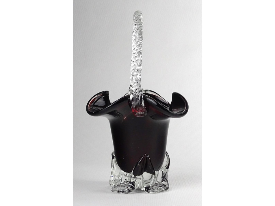 Hibátlan állapotú, bordóra színezett művészi üveg kosár dísztárgy, cseh fújt üveg a XX. század második feléből.
