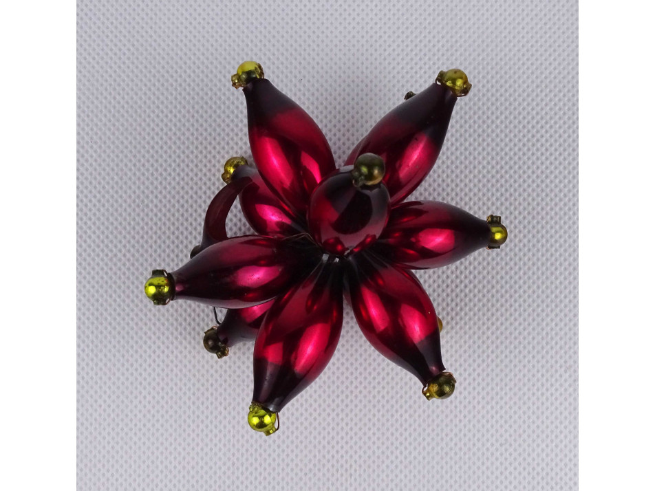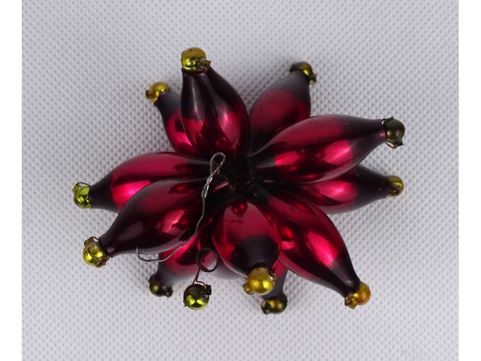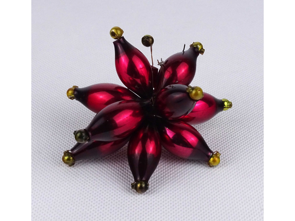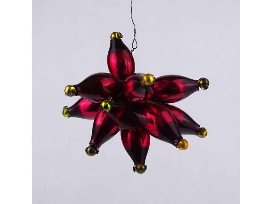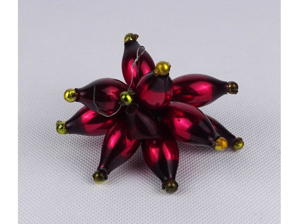 Régi, szép állapotú, bordó színű, hosszúkás üveg gyöngyökből összeállított, csillag alakú karácsonyfadísz. Az egyik eleme törött, de így is látványos darab.