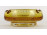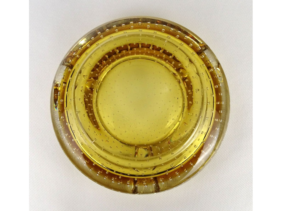 Hibátlan állapotú, borostyánsárgára színezett, levegőbuborékos művészi üveg, cseh fújt üveg hamutál a XX. század második feléből. Alján a fúvás, szakítás kicsiszolt nyoma szépen látható.