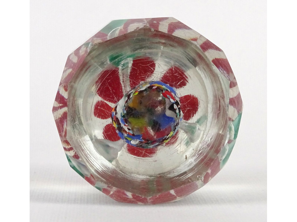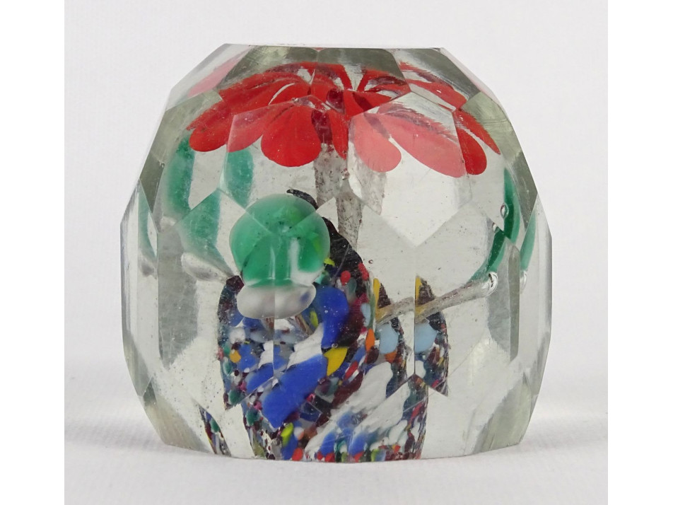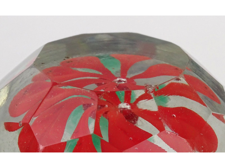 Régi, nagy méretű, szép állapotú, 41 lapra csiszolt, fúj üveg íróasztali kellék, levélnehezék. Belsejében színes, részletgazdag fúvott üveg virág látható.