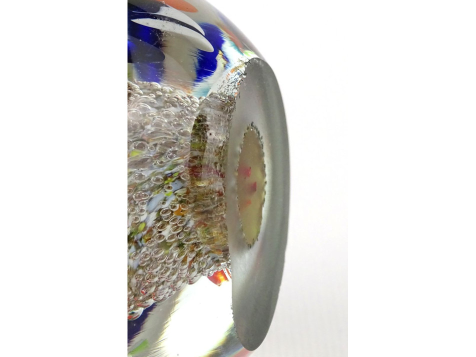 Régi tömör üveg dísztárgy, belsejében mályva fúvott színes virágokkal díszítve. Hibátlan állapotú íróasztali kellék, levélnehezék.