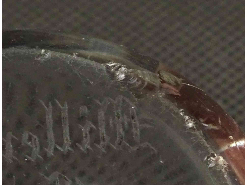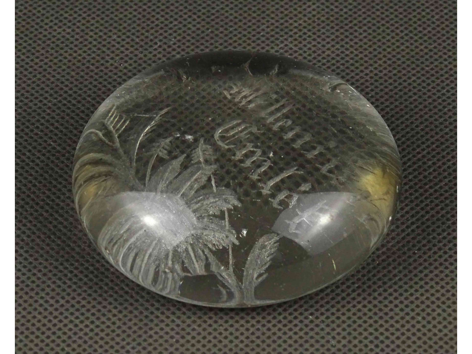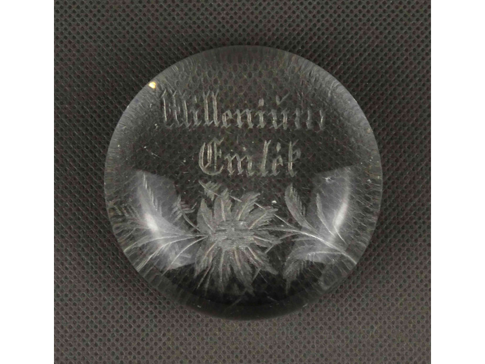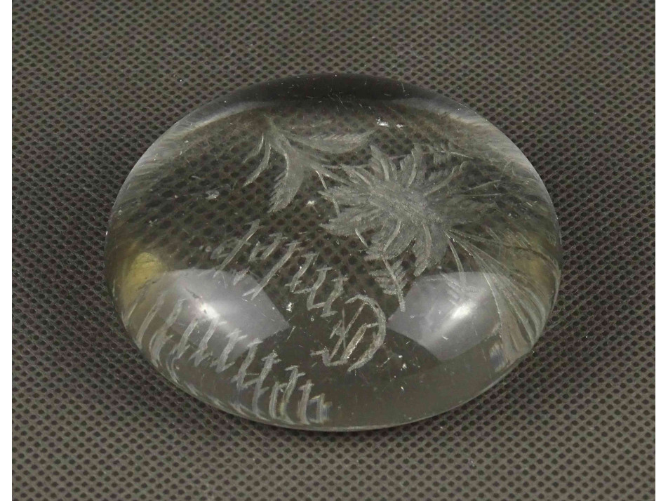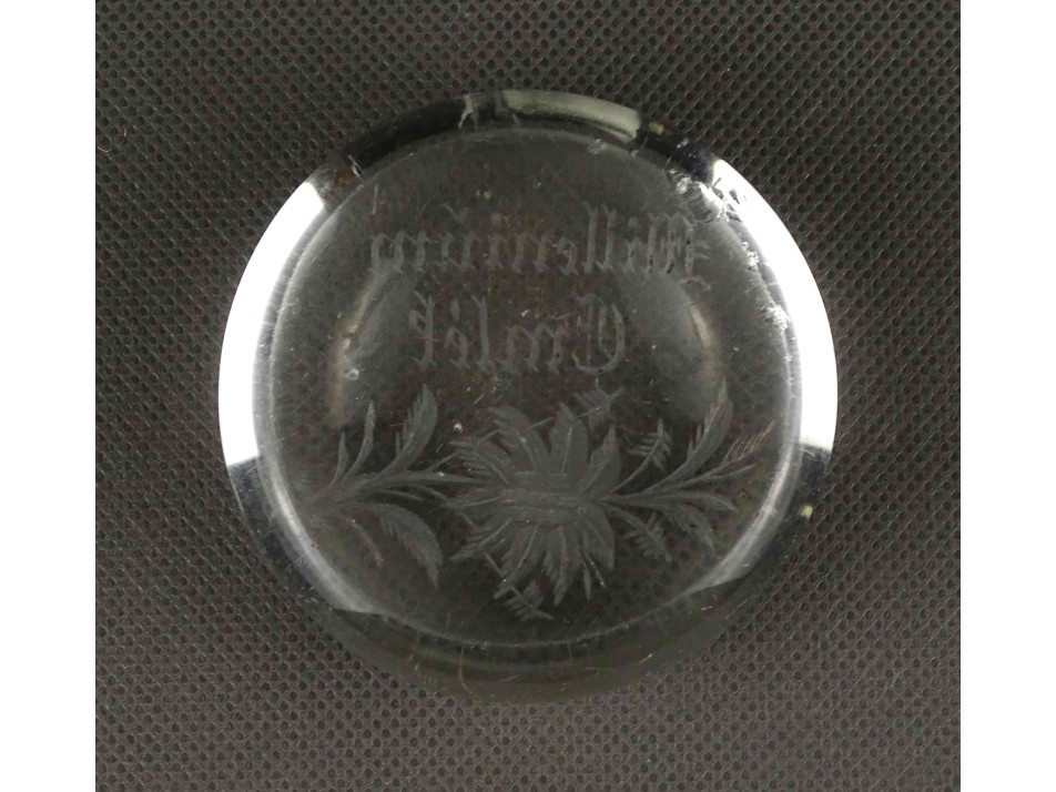 Antik, szép állapotú, üveg levélnehezék, íróasztali kellék, rajta csiszolt virágminta és felirat. Alján több ponton lepattanások láthatók.
