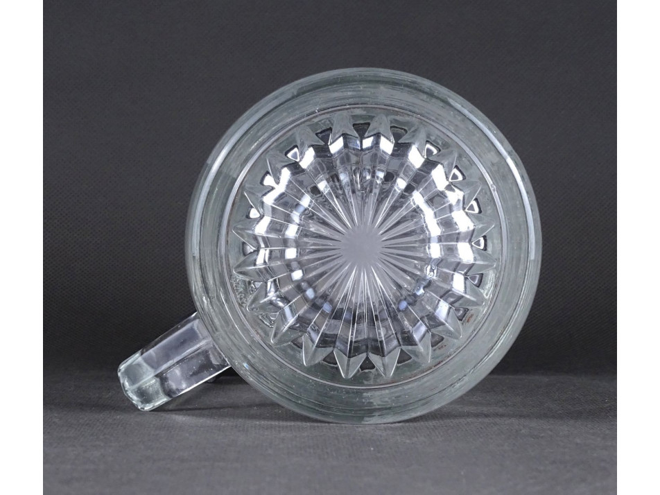 Szép állapotú ónfedeles üveg söröskorsó, sörös krigli. Oldalán fehér vadászjelenet díszítéssel, nyulakkal és kacsákkal.