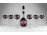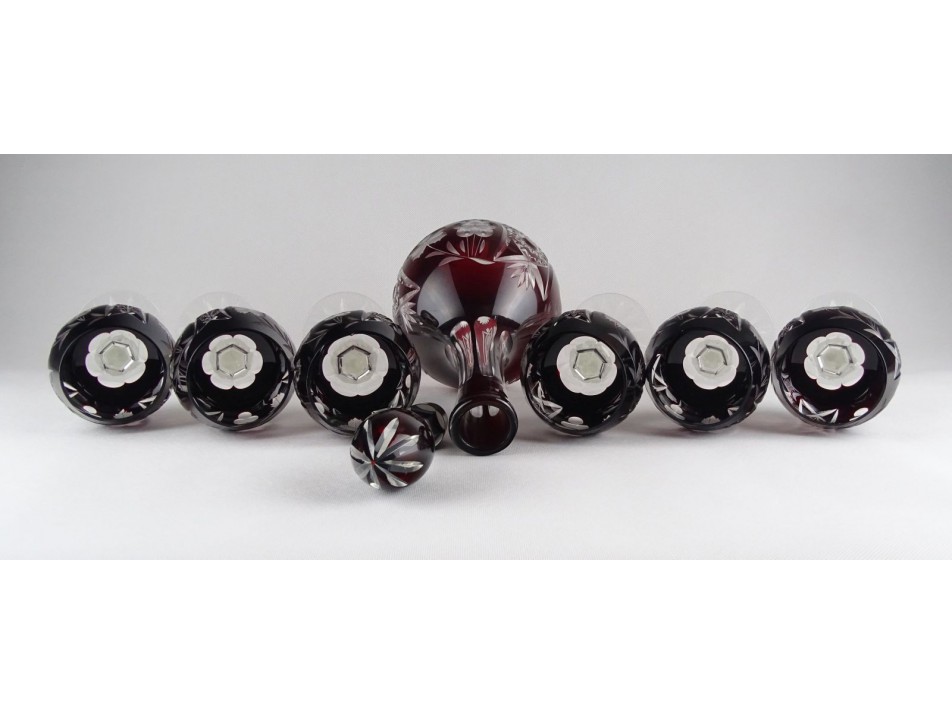 Szép állapotú, bordó színű, csiszolatokkal gazdagon díszített kristály kínáló készlet, nagyméretű dugós üveggel. A darabokon szőlőfürt és szőlőlevél motívumok láthatók. Az egyik pohárnál picike belső lepattanás. Lásd fotó!